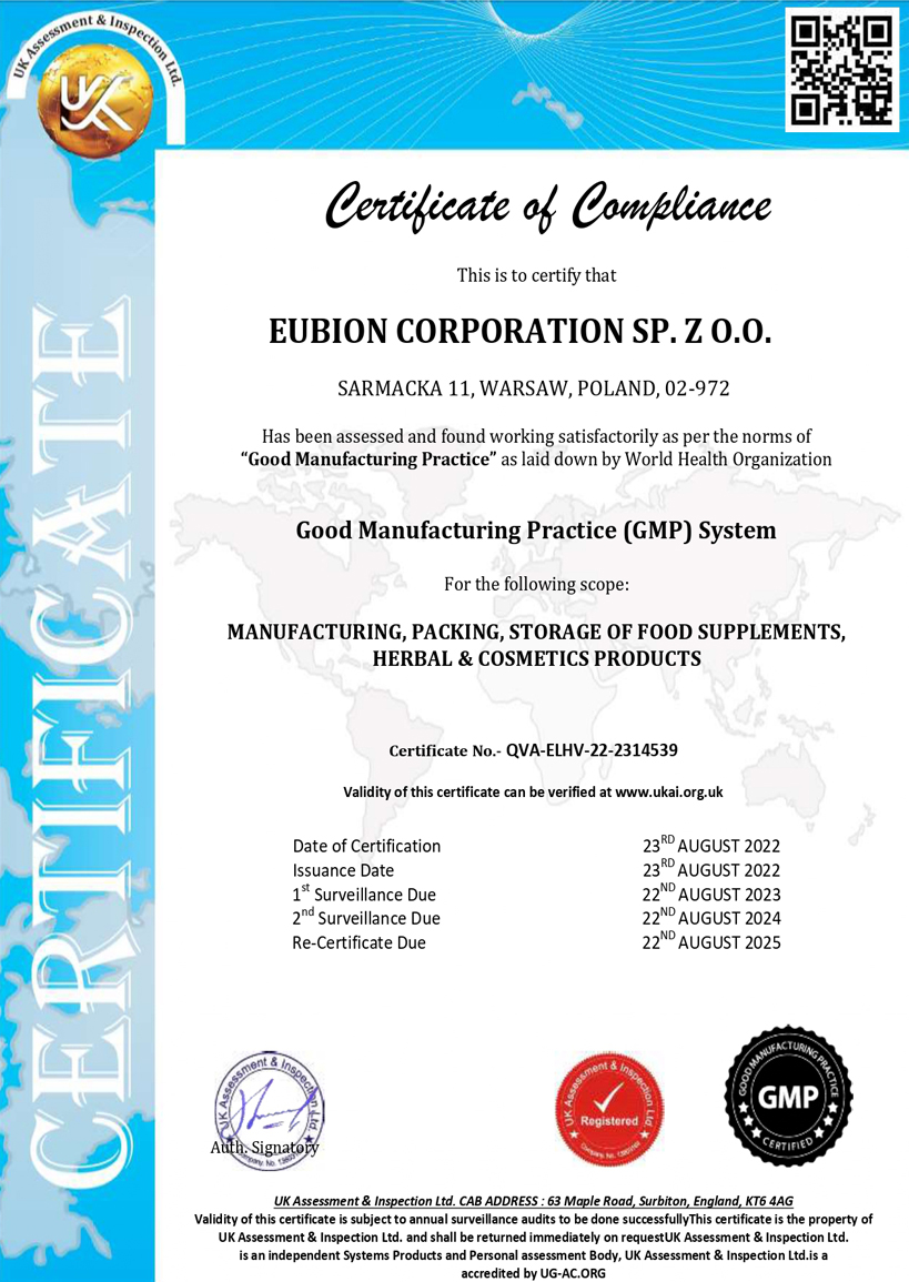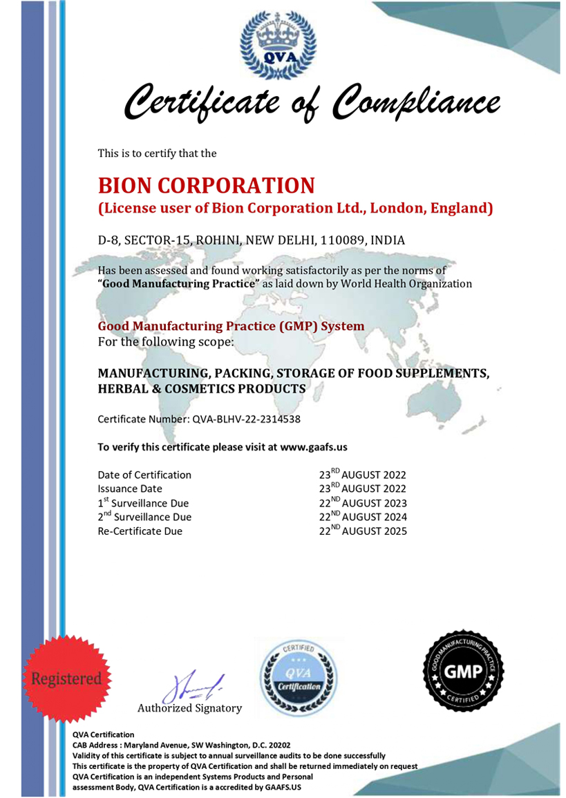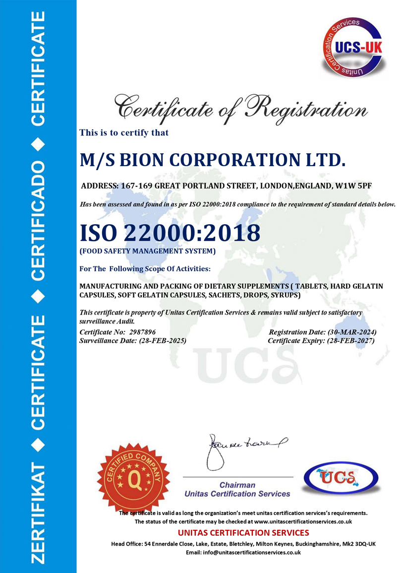 Our products are manufactured according to stringent quality norms of GMP guidelines & standards set by IFS and HACCP. At our disposal we have trained, highly qualified staff, modern, well quipped premises & high tech machinery that meet all the requirements of EU regulations & legislations. Bion Corporation approaches the global market with a vision of human health.