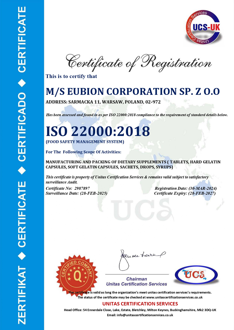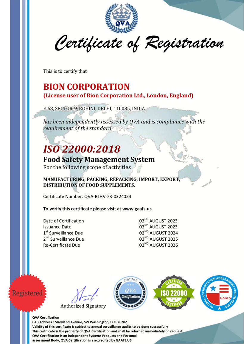Our products are manufactured according to stringent quality norms of GMP guidelines & standards set by IFS and HACCP. At our disposal we have trained, highly qualified staff, modern, well quipped premises & high tech machinery that meet all the requirements of EU regulations & legislations. Bion Corporation approaches the global market with a vision of human health.